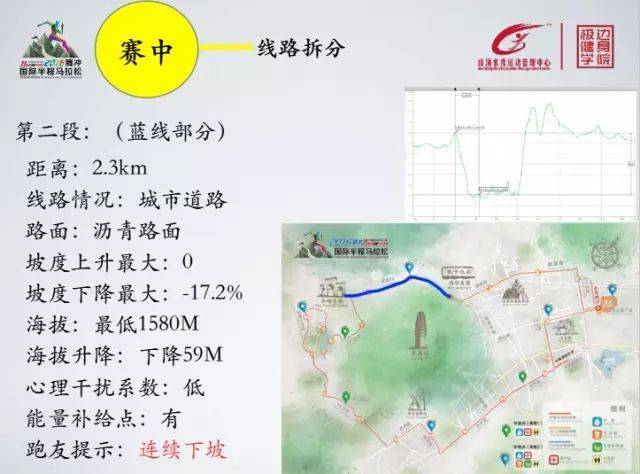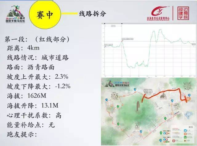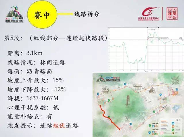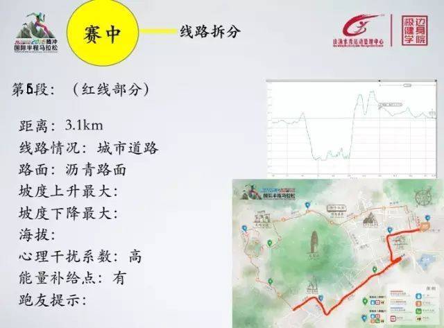 跑友提示:本赛道不求快,求稳。比赛经验不丰富的跑友,选择走会更明智。用身体重心的改变来体验双脚不由自由的往前,保持比较平稳的速度,积蓄体力。