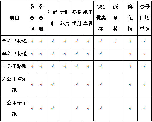 (参赛包、参赛服、参赛手册、号码布、纸巾、鲜花饼、能量棒)