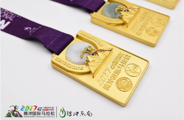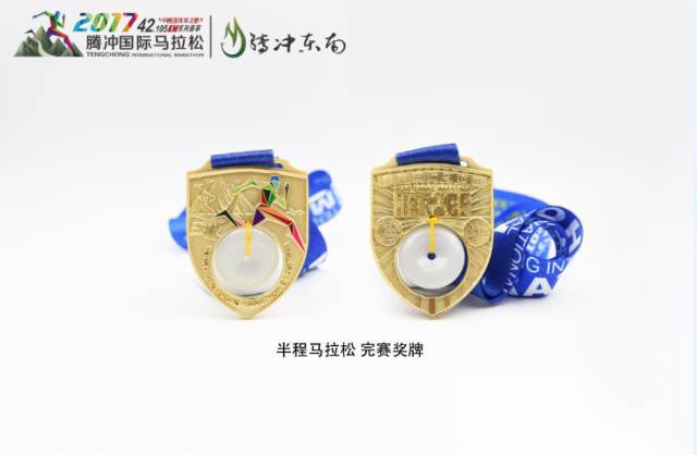 腾冲是最接近缅甸翡翠原产地的地方,加工、经营翡翠的历史已有600多年,2005年曾被亚洲珠宝联合会授予“中国翡翠第一城”的称号。2017 腾冲国际马拉松延续上一届特色, 推出具有腾冲特色的翡翠奖牌,通过传统工艺将一整块翡翠打磨、抛光并结合现代工艺,打造一块精致的半程马拉松完赛翡翠奖牌。