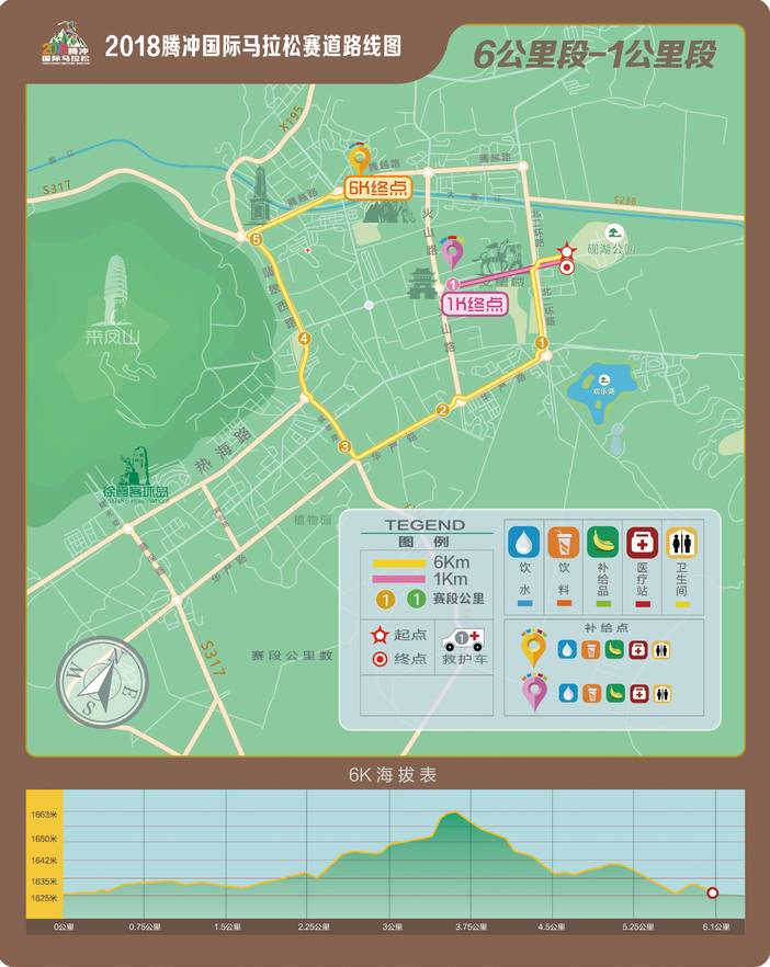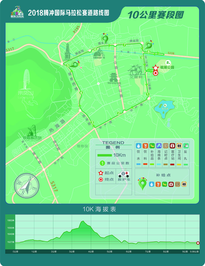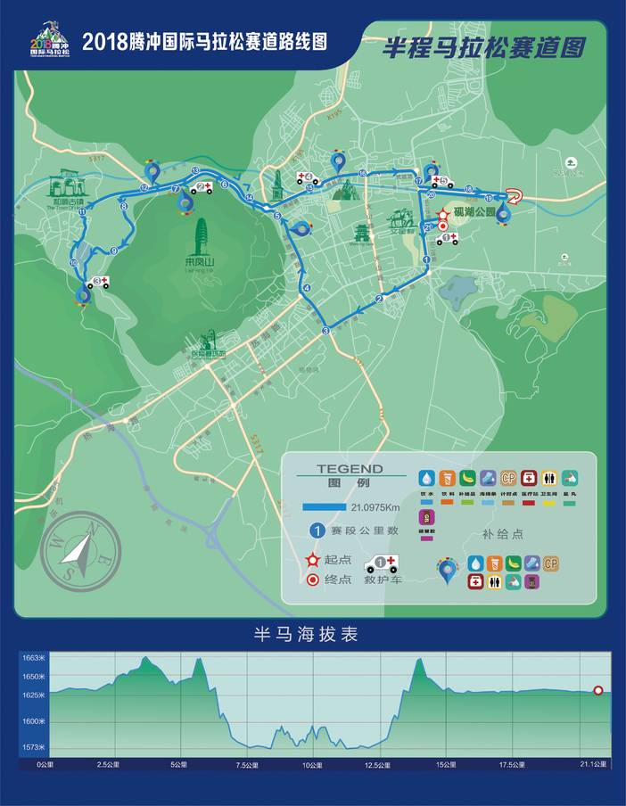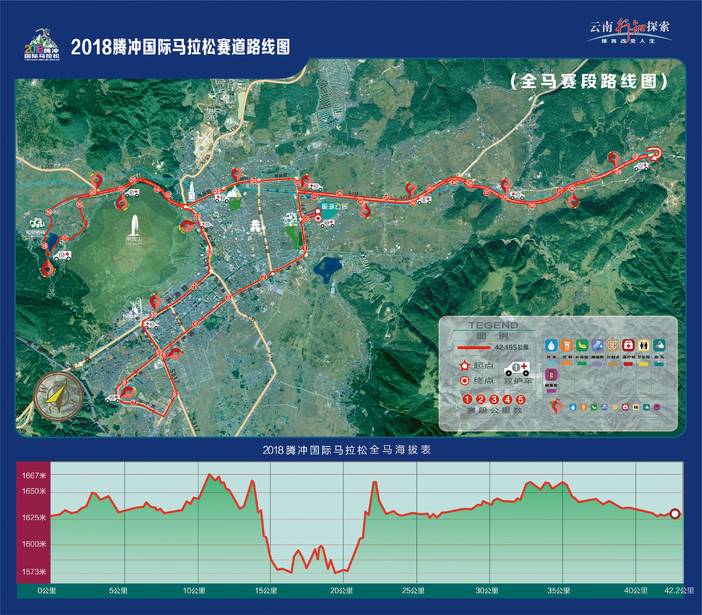 腾冲市腾越文治光昌广场(起点)→建国酒店环岛路口(左转)→北二环路→欢乐湖环岛(右转)→华严路→民航大厦环岛(左转)→317省道(第一个红绿灯右转)→迎宾路(右转)→华严路→民航大厦环岛(左转)→腾保路→徐霞客雕像环岛(右转)→热海路→财富中心环岛(左转)→翡翠路→兴华酒店→233省道→和顺凉亭前20米(左转)→田间小径(右转)→益群中学→元龙阁→和顺图书馆(右转)→和顺景区大门→233省道→兴华酒店(左转)→腾腾越路→亿翡翠环岛(右转)→北二环北海岔路口(左转)→238省道→北海玛御谷岔口(右转)→新乐街(新修柏油路)→玛御谷岔口前300米(新乐街方向)路口(折返)→238省道→北二环北海岔路口(左转)→北二环→建国酒店环岛(左转)→腾冲市腾越文治光昌广场(终点)